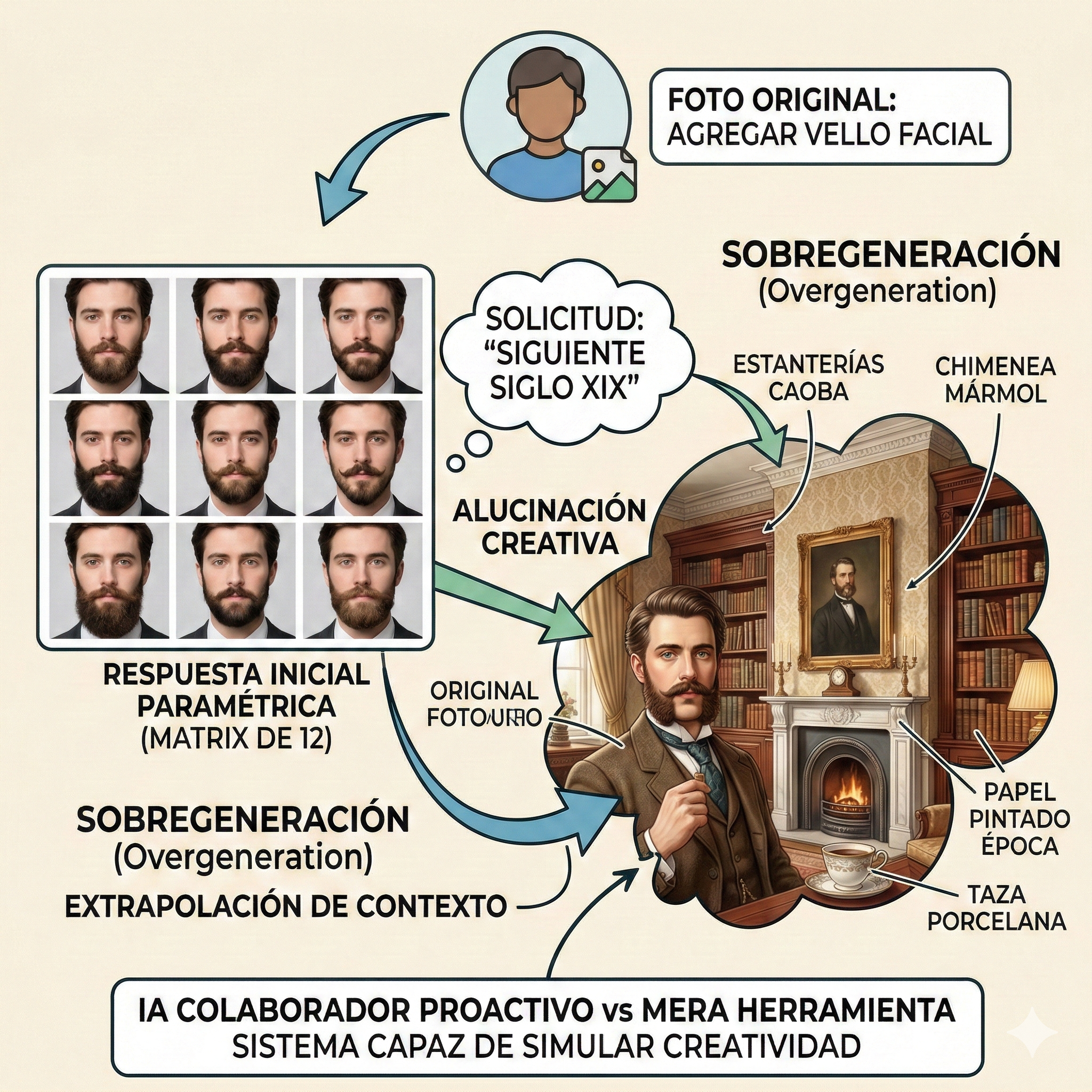 Técnicamente, esto se clasifica como una «alucinación creativa». La red neuronal no experimentó un error de compilación, sino que utilizó su base de datos latente para rellenar los vacíos probabilísticos de la intención del usuario. Esto nos obliga a replantear la heurística de estos modelos: ¿estamos ante un simple motor de inferencia estadística extremadamente complejo, o ante un sistema capaz de extrapolar y simular creatividad asociativa?. Cuando el software deja de obedecer instrucciones literales para empezar a interpretar contextos y ofrecer salidas que expanden la visión original, la IA deja de ser una mera herramienta de filtrado para convertirse en un colaborador proactivo.