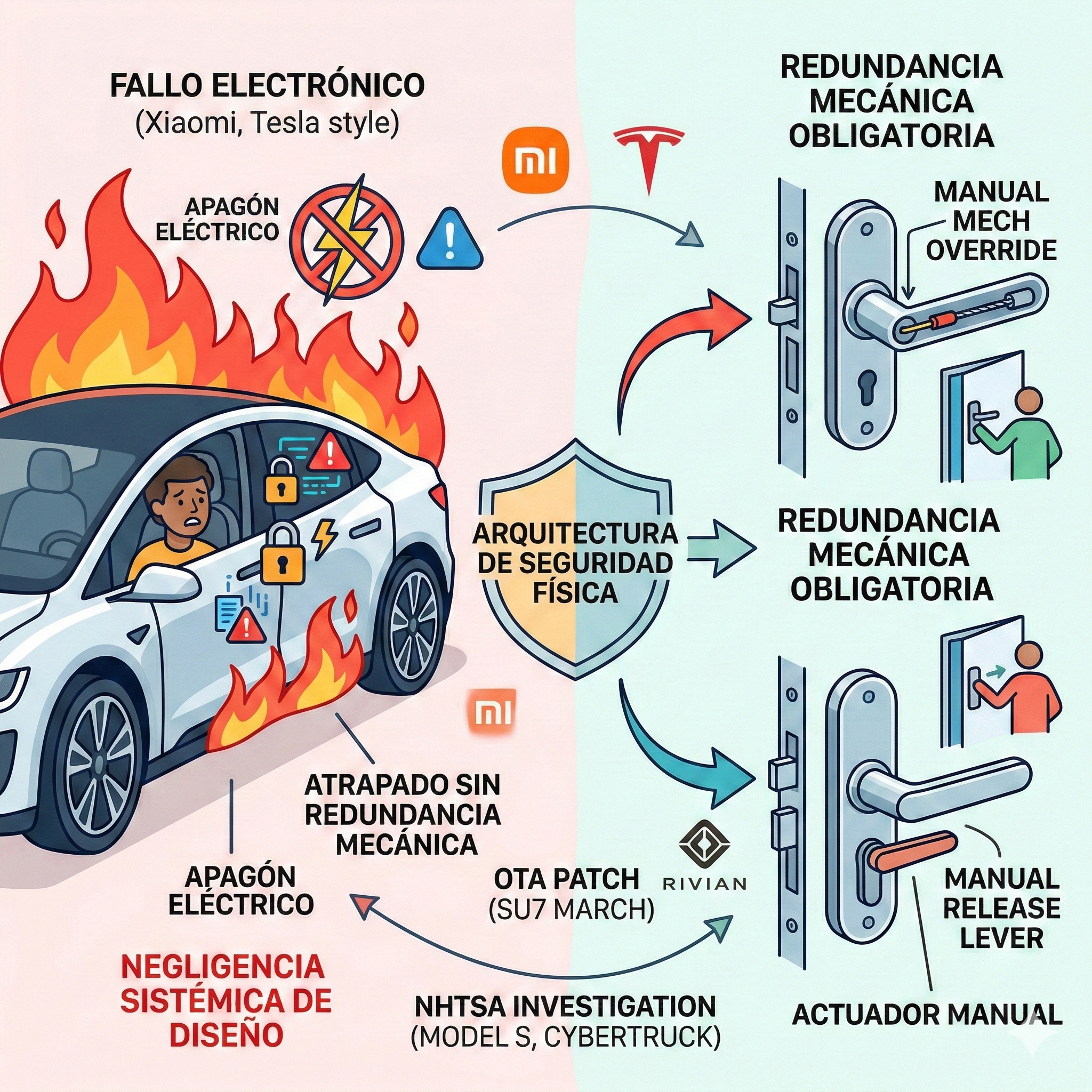 La transición hacia arquitecturas automotrices definidas por software (Software-Defined Vehicles) está introdugiendo puntos únicos de fallo inaceptables en los estándares de seguridad física. El reciente accidente de un Xiaomi SU7 en Chengdu es un caso de estudio forense trágico: tras un impacto y posterior incendio, el conductor falleció carbonizado al quedar atrapado en el habitáculo. La causa principal fue el bloqueo del sistema electrónico de apertura de puertas, inspirado en el diseño del Tesla Model S.