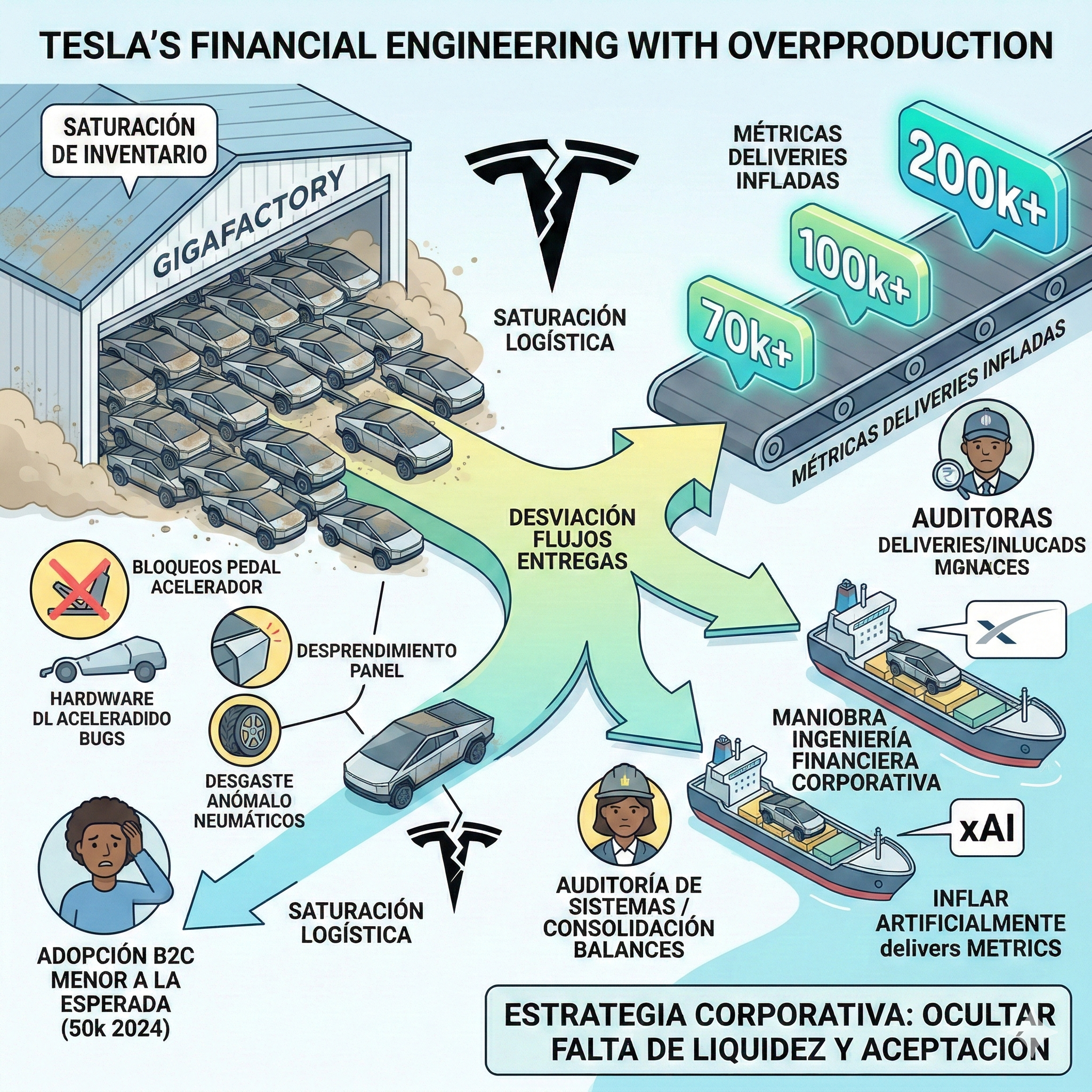 Analizando las métricas de la cadena de suministro y ventas de vehículos eléctricos, el despliegue del Tesla Cybertruck expone serias deficiencias operativas y un uso cuestionable de la estructura corporativa. Anunciado en 2019 con una estética divisiva de acero inoxidable (técnicamente difícil de escalar y con tolerancias problemáticas), Elon Musk proyectaba un flujo de ventas de 250.000 unidades anuales.