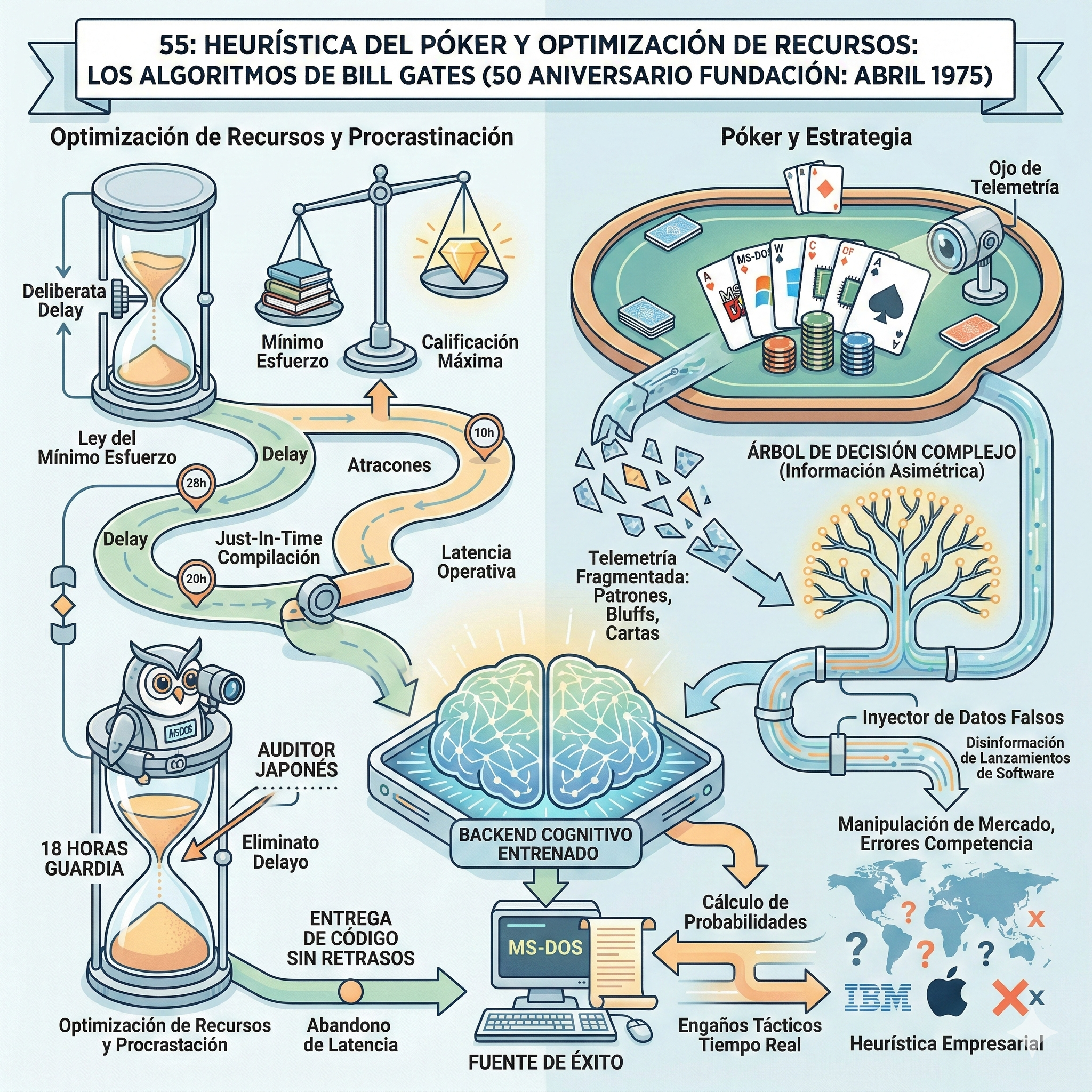 Por el contrario, el póker sirvió como motor de entrenamiento para su heurística empresarial. En un entorno de información asimétrica como una partida de cartas, el sistema debe recolectar telemetría fragmentada: patrones de apuestas, frecuencia de bluffs y cartas visibles. Gates procesaba estos conjuntos de datos incompletos para desarrollar árboles de decisión complejos. Más importante aún, aprendió a inyectar datos falsos en el sistema (información errónea sobre lanzamientos de software) para inducir errores en la competencia y manipular el mercado. Es una lección técnica brutal: el éxito de Microsoft no solo se basó en el código fuente de MS-DOS, sino en un backend cognitivo entrenado para calcular probabilidades y ejecutar engaños tácticos en tiempo real.