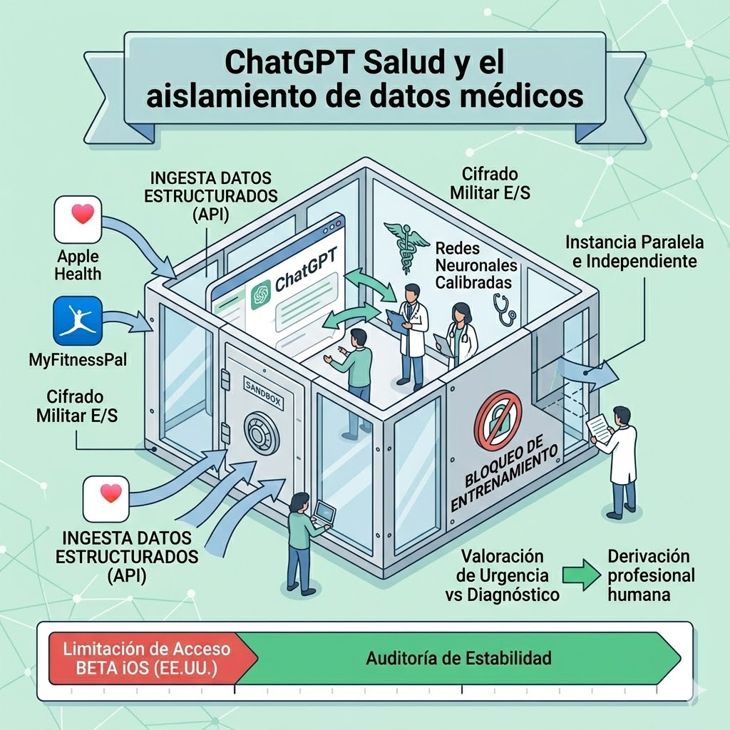 Desde la perspectiva del analista de seguridad, la arquitectura de privacidad es robusta. Dada la criticidad de la información procesada, ChatGPT Salud se ejecuta en una instancia paralela e independiente, implementando cifrado de grado militar tanto para los datos almacenados en el servidor como para el tráfico de red en tránsito. Para mitigar el riesgo de exfiltración o memorización no deseada, OpenAI ha bloqueado la ingesta de estos historiales clínicos conversacionales para el entrenamiento de futuros modelos. Como protocolo de despliegue controlado, el lanzamiento se está ejecutando progresivamente en fase beta, limitando el acceso inicial a un subconjunto de usuarios de iOS en Estados Unidos para auditar su estabilidad antes del despliegue masivo.