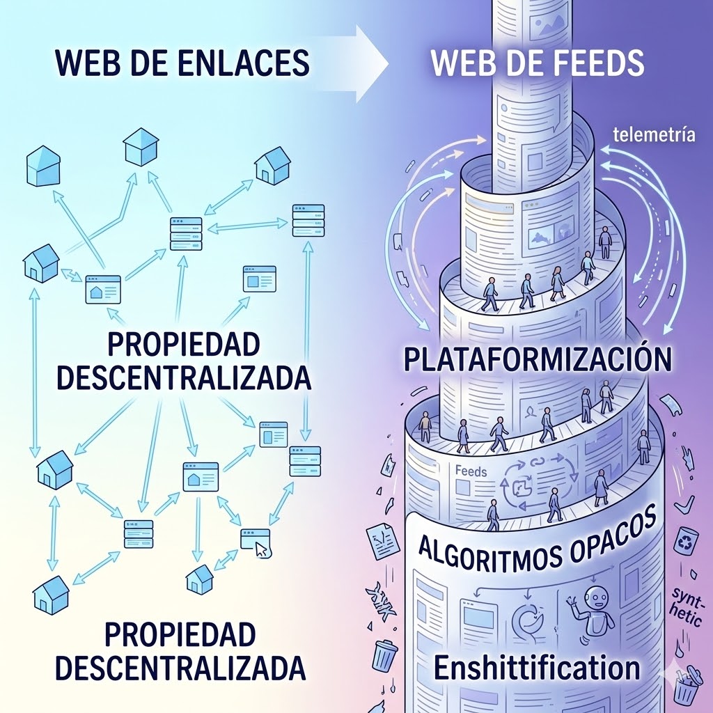 Revisando el impacto de la red a través de la retrospectiva de 20 años de publicaciones especializadas, mi diagnóstico técnico es innegable: hemos sufrido una involución arquitectónica masiva disfrazada de progreso. Hemos transitado de una «Web de Enlaces», donde el usuario controlaba la navegación de forma descentralizada, a una «Web de Feeds», donde algoritmos opacos de plataformas hegemónicas (TikTok, Instagram, YouTube) secuestran nuestra atención inyectando contenido diseñado para maximizar la interacción publicitaria y la dopamina.