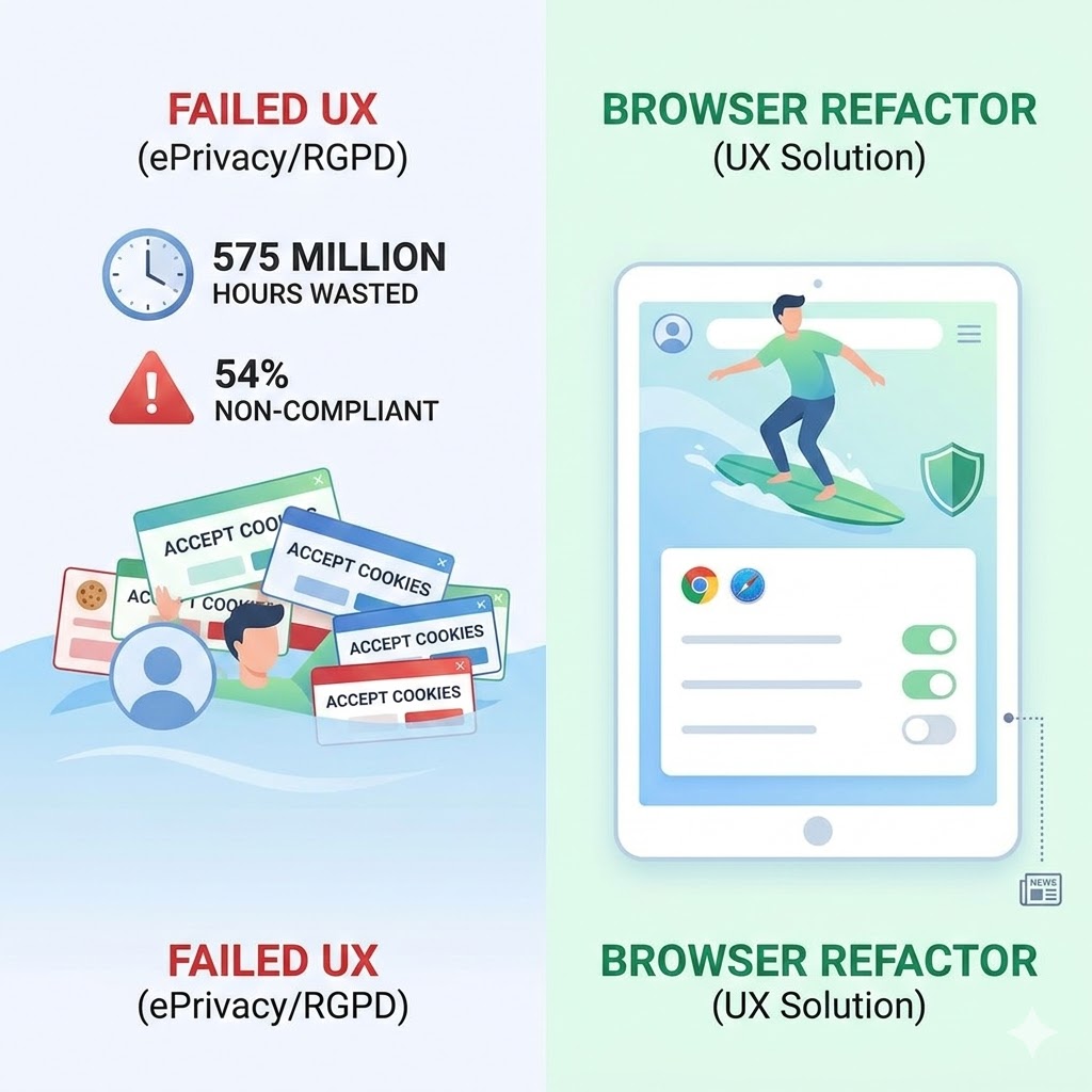 A nivel de Experiencia de Usuario (UX), muy pocas implementaciones han resultado tan fallidas como la ePrivacy Directive de 2009 y el RGPD de 2018, que impusieron los intrusivos avisos de cookies. Como técnicos y navegantes, llevamos años sufriendo una interfaz que ha empeorado la privacidad al inducir una severa «fatiga de clics». El usuario final, agotado, acepta los términos mecánicamente, lo que pervierte y destruye el propio concepto de consentimiento informado.