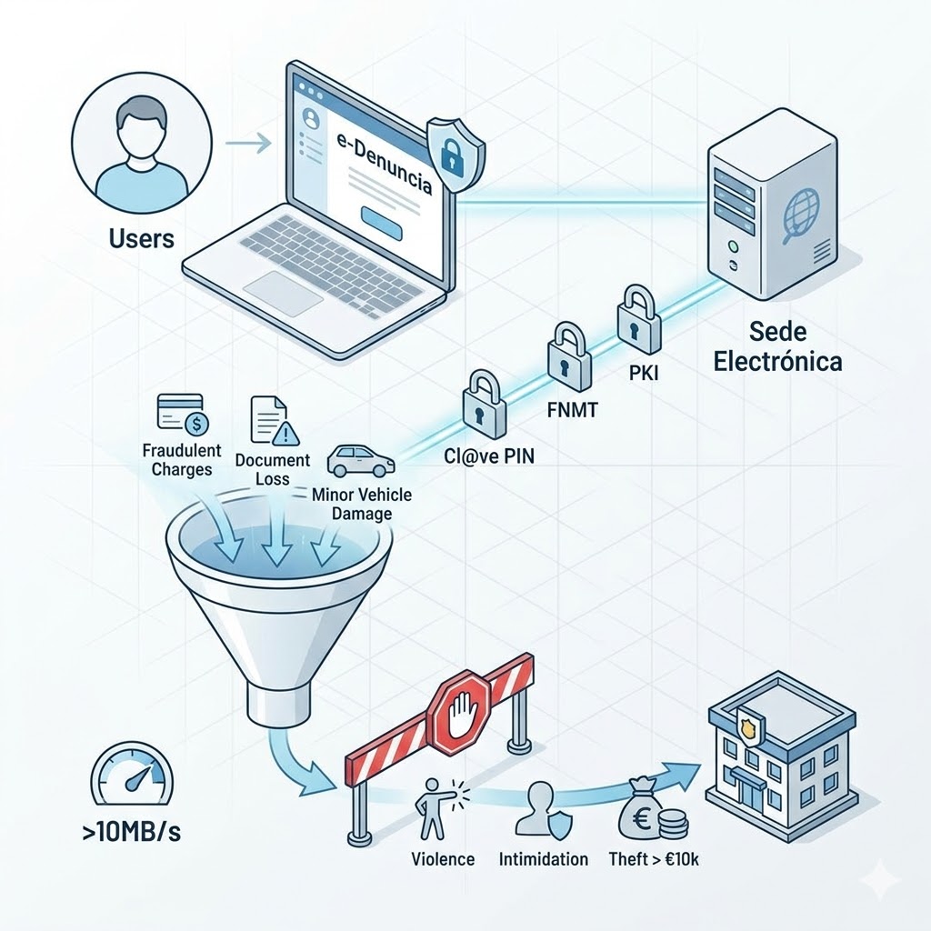 Sin embargo, el motor de reglas de negocio del sistema impone restricciones estrictas de filtrado penal. Los algoritmos impiden la denuncia telemática de delitos que incluyan violencia física, intimidación o el robo de capital superior a 10.000 euros. Está optimizado exclusivamente para incidencias automatizables: cargos fraudulentos, sustracción de componentes de vehículos sin fuerza bruta, extravío de documentos o delitos de daños menores. Aunque la atención física nunca desaparecerá para delitos de alto impacto, esta refactorización permite aliviar la carga administrativa de las unidades locales y agilizar la experiencia de usuario del ciudadano