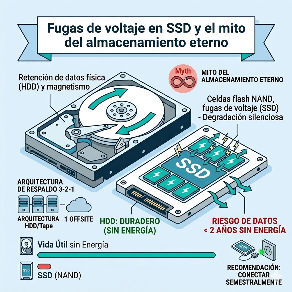 Analizando la viabilidad del almacenamiento en frío (cold storage) para copias de seguridad a largo plazo, me encuentro constantemente con un error de concepto grave en la comunidad: la creencia de que los discos de estado sólido (SSD) son infalibles por carecer de partes mecánicas. Si bien es cierto que la ausencia de platos giratorios los hace inmunes a fallos mecánicos tradicionales, esta misma arquitectura los condena a una degradación silenciosa cuando se les priva de energía eléctrica.