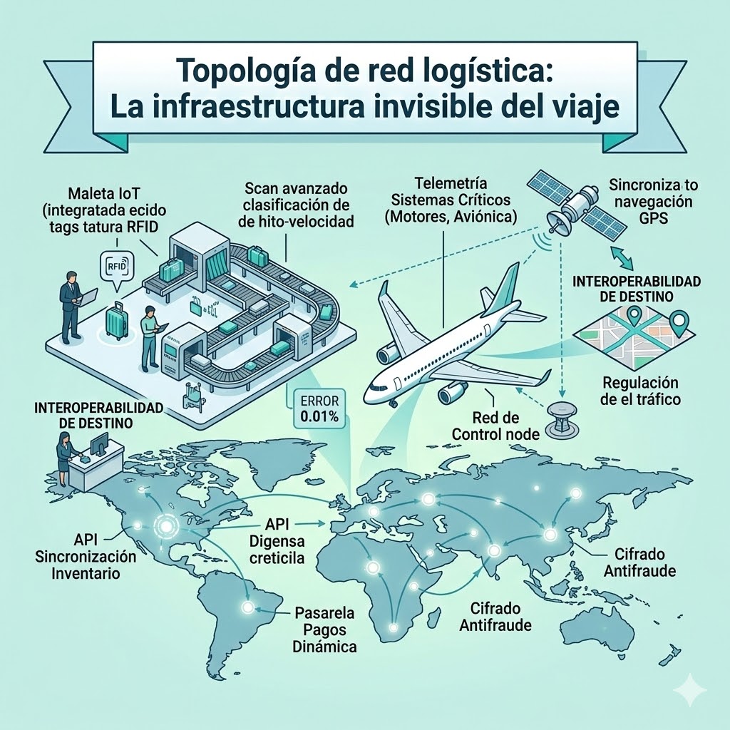 Al llegar al aeropuerto, nos sumergimos en una red distribuida compleja. La identidad del viajero se pre-procesa en formato digital; somos un hash de datos de pasaporte y asientos preasignados fluyendo por los nodos de control fronterizo. Uno de los mayores hitos de integración lo encontramos en el rastreo de equipaje: cada maleta recibe un identificador único, convirtiéndose en un objeto de IoT (Internet of Things) que interactúa con kilómetros de cintas automatizadas, escáneres de rayos X y algoritmos de clasificación de alta velocidad, manteniendo un margen de error estadísticamente mínimo.
